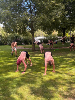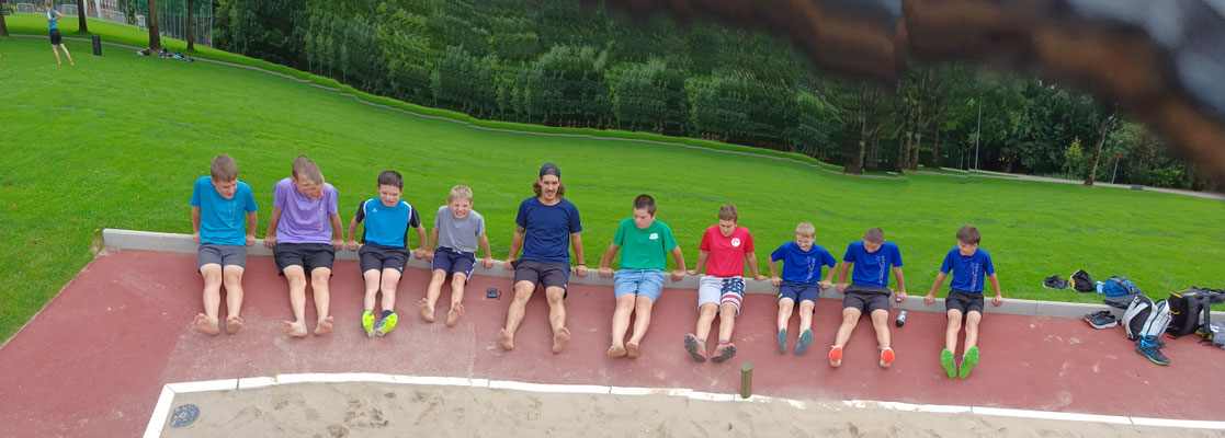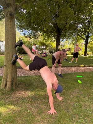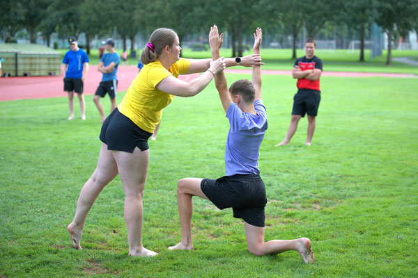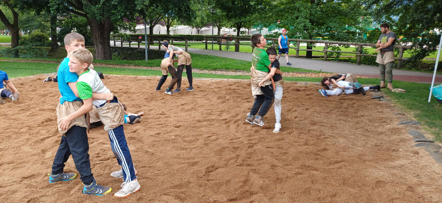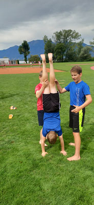 Weil wir so nette Kinder waren, durften wir 45 Minuten in den See baden. Danach ging es weiter mit Bodenturnen, Schwingen, Crossfit und Steinstossen.