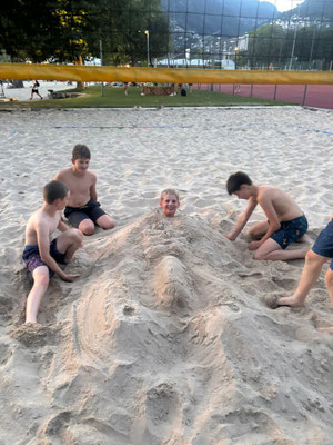Heute Morgen sind wir sanft von Andi geweckt worden. Das Frühstuck war nicht besonders aber okay. Die Gruppe 1 und 2 war zuerst Schwingen/Ringen, die Gruppe 3 war Bogenschiessen. Wir waren Bogenschiessen es war sehr spannend und sehr cool. Wir haben einen kleinen Wettkampf gemacht, Lean und Moritz haben gewonnen. Gruppe 1 hat bei Remo Steinstossen gehabt. Die Gruppe 2 hat bei Luca K. Hochweitsprung gehabt. Die kleinsten waren bei Selina Bodenturnen. Es war sehr cool, wir haben den Flic Flac geübt. Es war noch sehr schwer die Angst zu überwinden, dass man nicht auf den Kopf fliegt. Zum Mittagessen gab es wieder etwas Spezielles und das war Vitello tonnato und Kartoffelsalat aber wir haben es nicht genommen, sondern Teigwaren. Dann ging es weiter um 13:15 dort haben wir eine Aktive Erholung gemacht das heisst wir haben Spiele gespielt. Weitsprung hat die Gruppe 1 gemacht. Lauf hat die Gruppe 2 bei Kilian gemacht. Wir hatten Hochweitsprung gemacht mit Luca K. Es war sehr heiss. Dann ging es an die Ausdauer von Gruppe 1/2 und Mauro, Lean und Nelia (den 12 min Lauf). Mauro, Lean und Nelia haben den 12 min Lauf gemacht, weil sie das Schwingen/Ringen ausgelassen haben, wo die Gruppe 3 gemacht hat. Dan sind wir in den See baden gegangen und hatten Spass. Zum Abendessen hat es Rösti und Geschnätzeltes gegeben. Die Rösti waren fein, aber wir fanden das Geschnätzeltes nicht so gut. Am Abend haben wir zwischen verschiedene Spiele aussuchen können, zwischen Beach Volleyball und auf der Wiese spielen. Die einten gingen später nochmal Flic Flac üben gegangen. Am Abend haben noch Linda und Nelia Fledermäuse gejagt mit dem Beach Volleyball. Jetzt dann gehen wir duschen und dann schlafen.